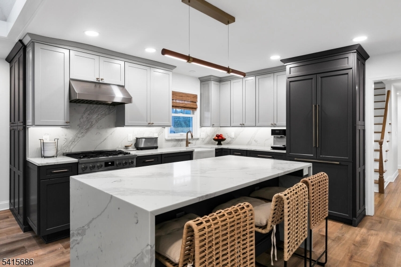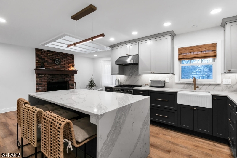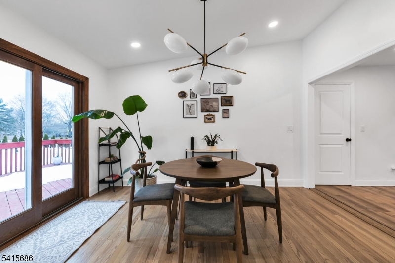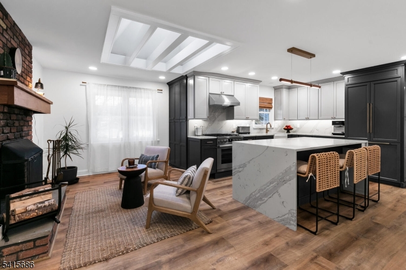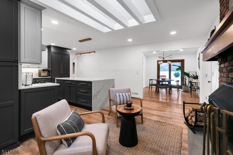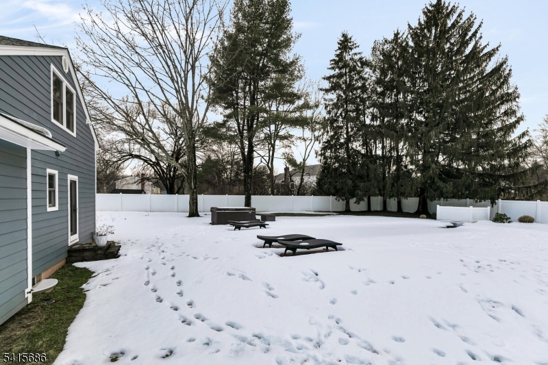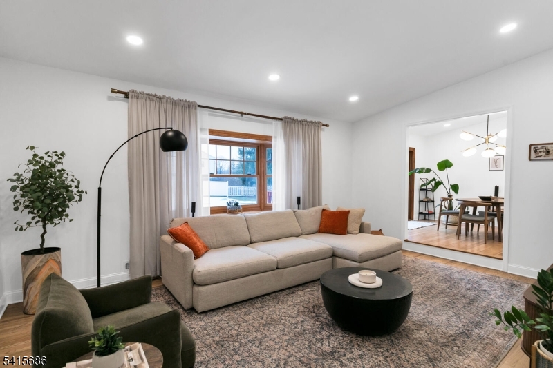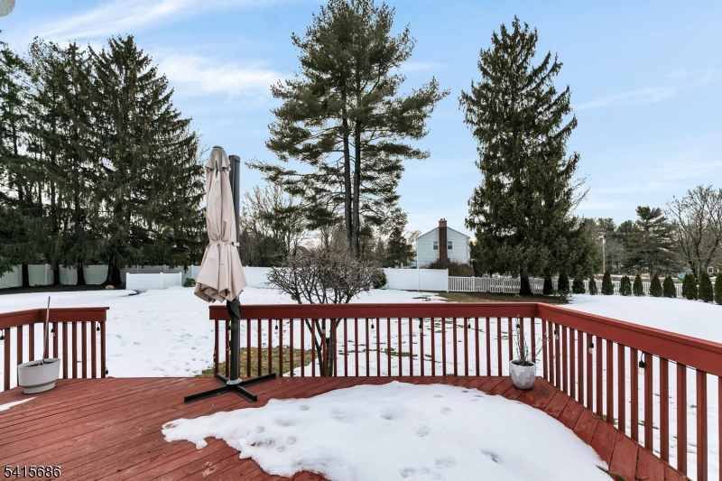 This beautifully renovated expanded 5-bedroom ranch is nestled on nearly an acre in a quiet, desirable neighborhood. This home offers exceptional privacy and entertainment space with a fully fenced backyard featuring a large deck, patio and a sparkling saltwater pool. Inside, the bright, interior offers abundant natural light, refinished hardwood floors, tall ceilings, and a cozy family room with a brick woodburning fireplace. The fully remodeled kitchen is a standout, featuring custom cabinetry, marble countertops, a large waterfall island with seating, high-end built-in appliances including a premium Dacor refrigerator, ideal for everyday meals. Enjoy gatherings in the living room and adjacent dining room which offers direct access to the deck and kitchen. The first-floor primary bedroom is spacious with a luxurious master bath extension and built-in wardrobe. All bathrooms were updated and boast modern finishes with the main bath featuring a freestanding soaking tub. Other improvements (2021-2023) include a new roof, front and patio doors, complete recessed lighting throughout, refinished floors, carpets replaced, new fence, paver walkway, and water filtration system. A partially finished basement includes a rec room, ample storage, and workout area. Move-in ready and meticulously updated, this wonderful home is conveniently close to shopping, parks, restaurants, and transportation in a top NJ school district offering the perfect blend of comfort, style, and location. GSMLS 4013499