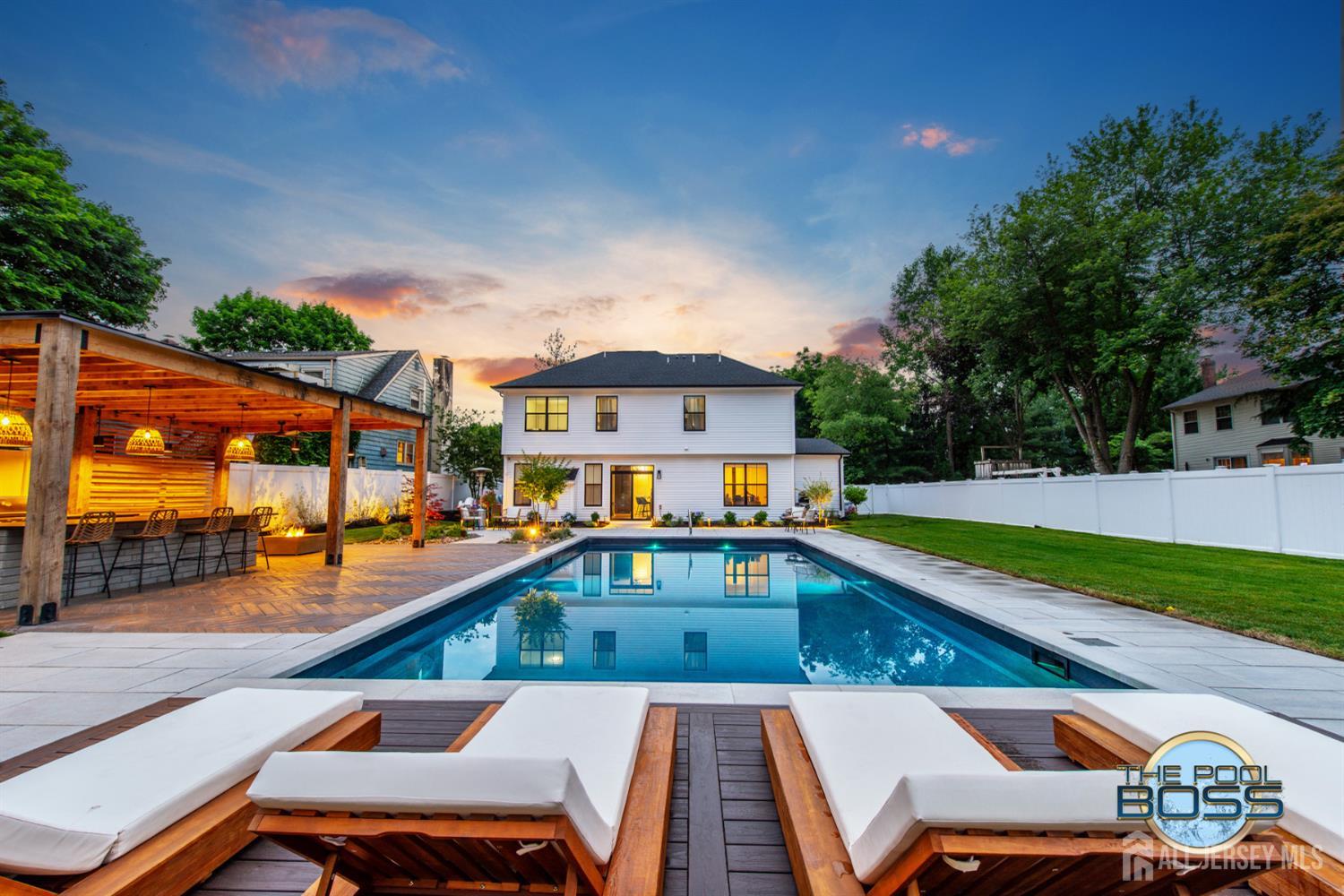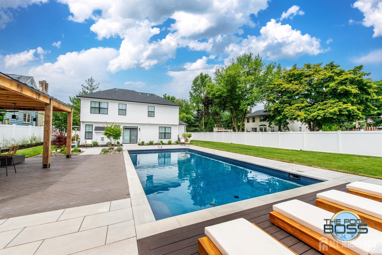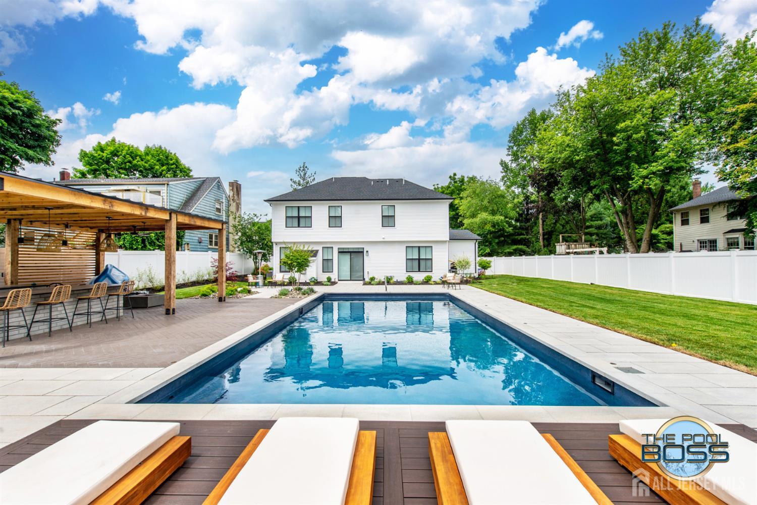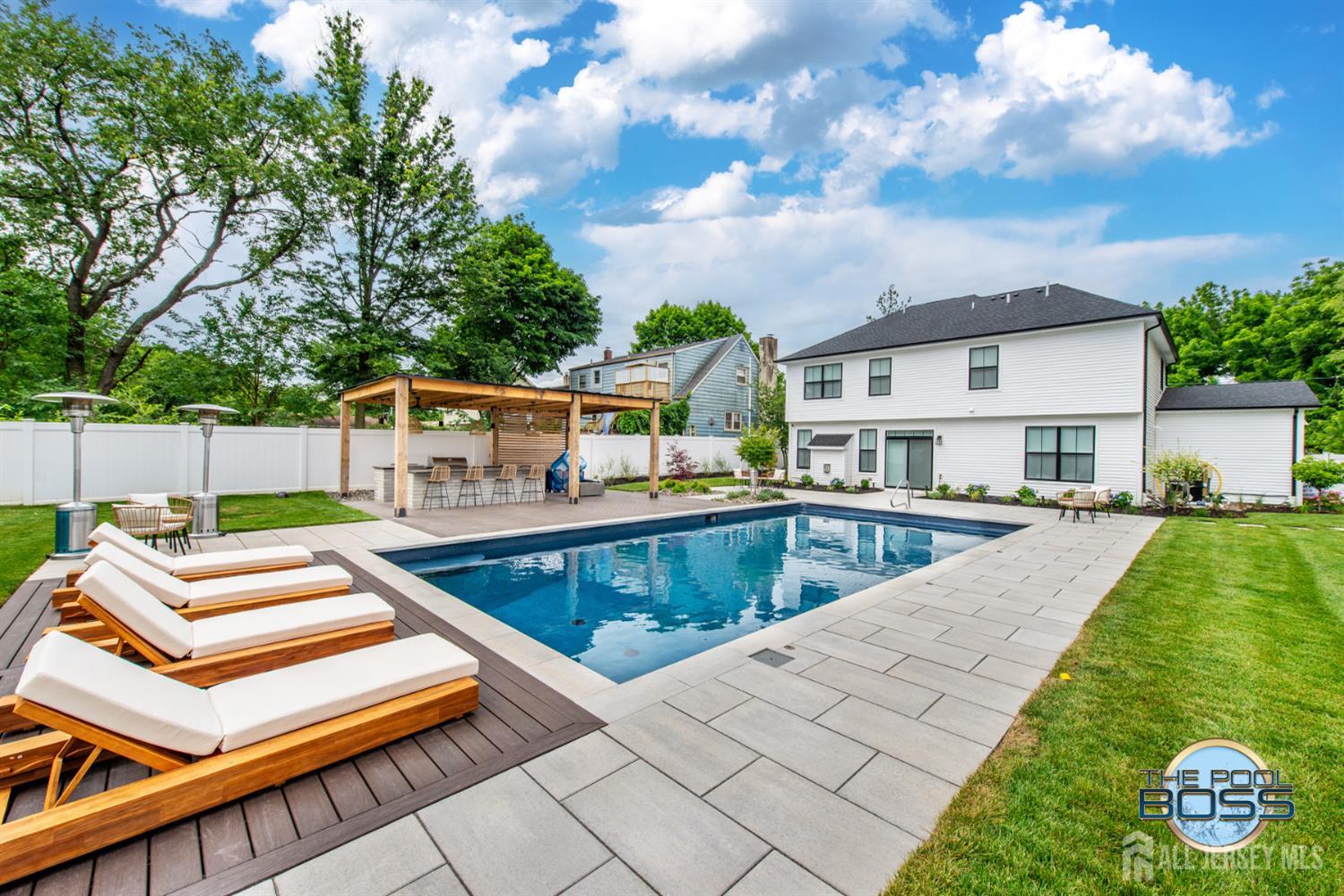 Welcome to 56 Philo Boulevard a stunning contemporary home where every detail has been curated for those who appreciate the finer things. Set on an exceptional lot in Edison, this 5-bedroom, 3-bathroom residence seamlessly blends refined interior living with one of the most extraordinary outdoor spaces you'll find in the area. The heart of this home extends well beyond its walls. Step outside to a true resort-caliber retreat: a custom inground pool framed by large-format bluestone coping, a designer timber-frame pavilion with exposed beam ceilings, ceiling fans, and ambient pendant lighting, and a fully equipped outdoor kitchen featuring stainless steel appliances, a built-in grill, premium dark countertops, and a generous island with bar seating. A concrete fire pit anchors the herringbone-patterned composite deck, creating an atmosphere that is equally suited for intimate evenings and effortless entertaining. Professionally landscaped grounds, mature trees, and strategic lighting complete the picture day or night, this backyard is simply unmatched. Inside the home reflects the same level of care and intentionality. This home boasts contemporary finishes, offering five generous bedrooms or use of an office/den and three full baths designed for comfortable, modern living. A first-floor room provides excellent flexibility, functioning beautifully as a private guest suite, home office, or den ideal for those seeking one-level convenience without sacrificing space. This home is completely move in ready, Schedule to see this home while you can! CJMLS 2613894R