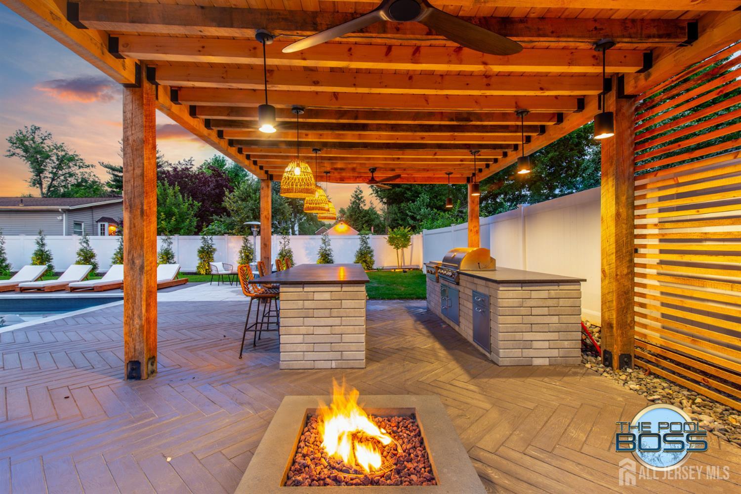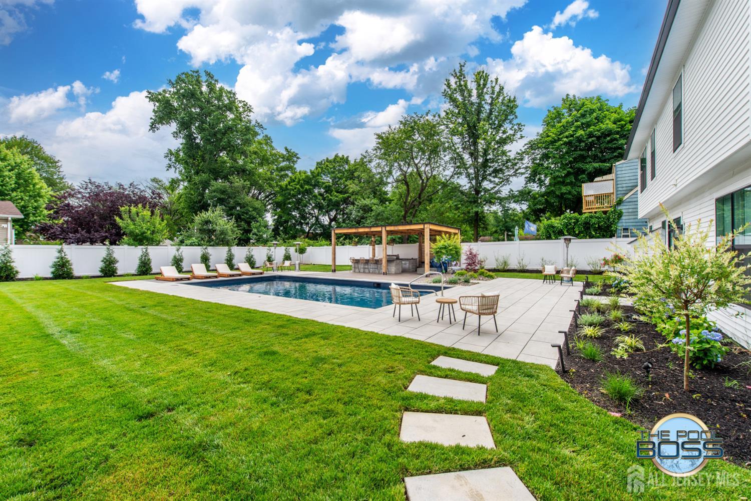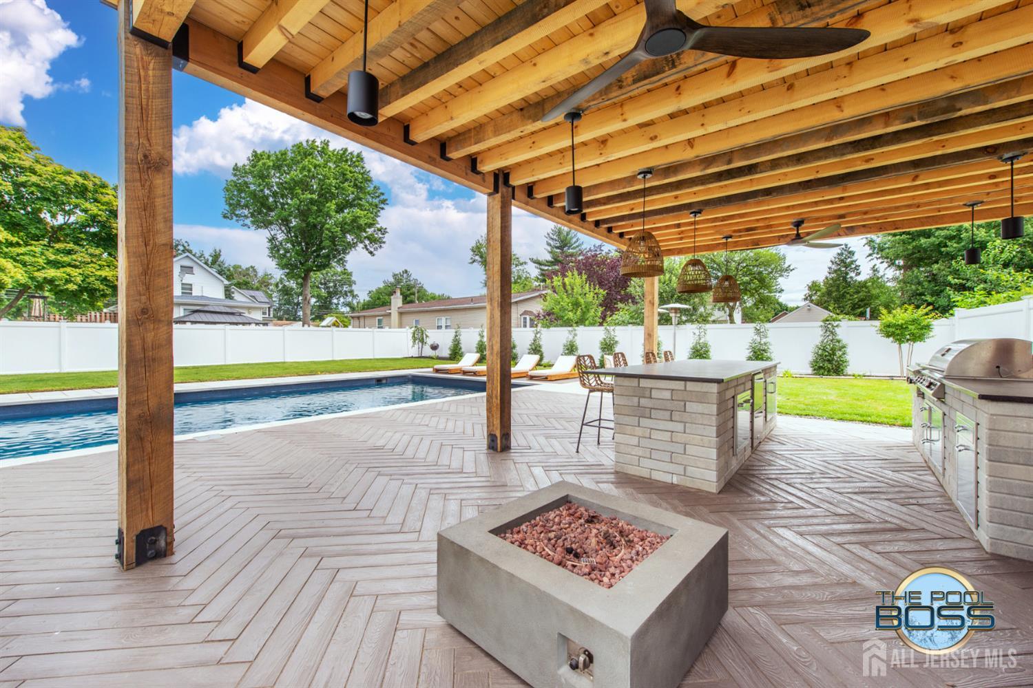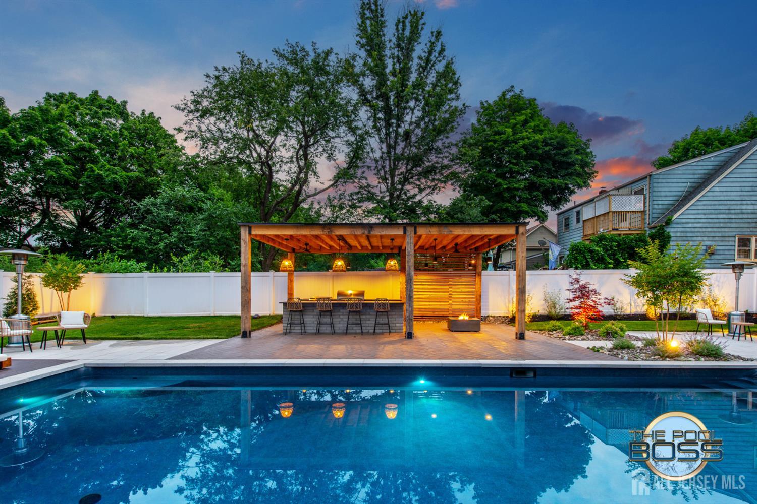 Welcome to 56 Philo Boulevard a stunning contemporary home where every detail has been curated for those who appreciate the finer things. Set on an exceptional lot in Edison, this 5-bedroom, 3-bathroom residence seamlessly blends refined interior living with one of the most extraordinary outdoor spaces you'll find in the area. The heart of this home extends well beyond its walls. Step outside to a true resort-caliber retreat: a custom inground pool framed by large-format bluestone coping, a designer timber-frame pavilion with exposed beam ceilings, ceiling fans, and ambient pendant lighting, and a fully equipped outdoor kitchen featuring stainless steel appliances, a built-in grill, premium dark countertops, and a generous island with bar seating. A concrete fire pit anchors the herringbone-patterned composite deck, creating an atmosphere that is equally suited for intimate evenings and effortless entertaining. Professionally landscaped grounds, mature trees, and strategic lighting complete the picture day or night, this backyard is simply unmatched. Inside the home reflects the same level of care and intentionality. This home boasts contemporary finishes, offering five generous bedrooms or use of an office/den and three full baths designed for comfortable, modern living. A first-floor room provides excellent flexibility, functioning beautifully as a private guest suite, home office, or den ideal for those seeking one-level convenience without sacrificing space. This home is completely move in ready, Schedule to see this home while you can! CJMLS 2613894R