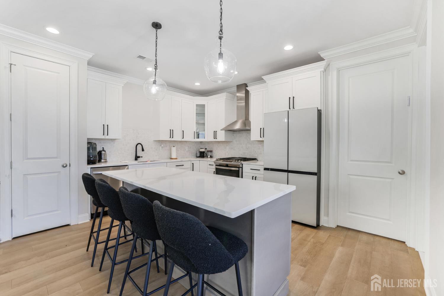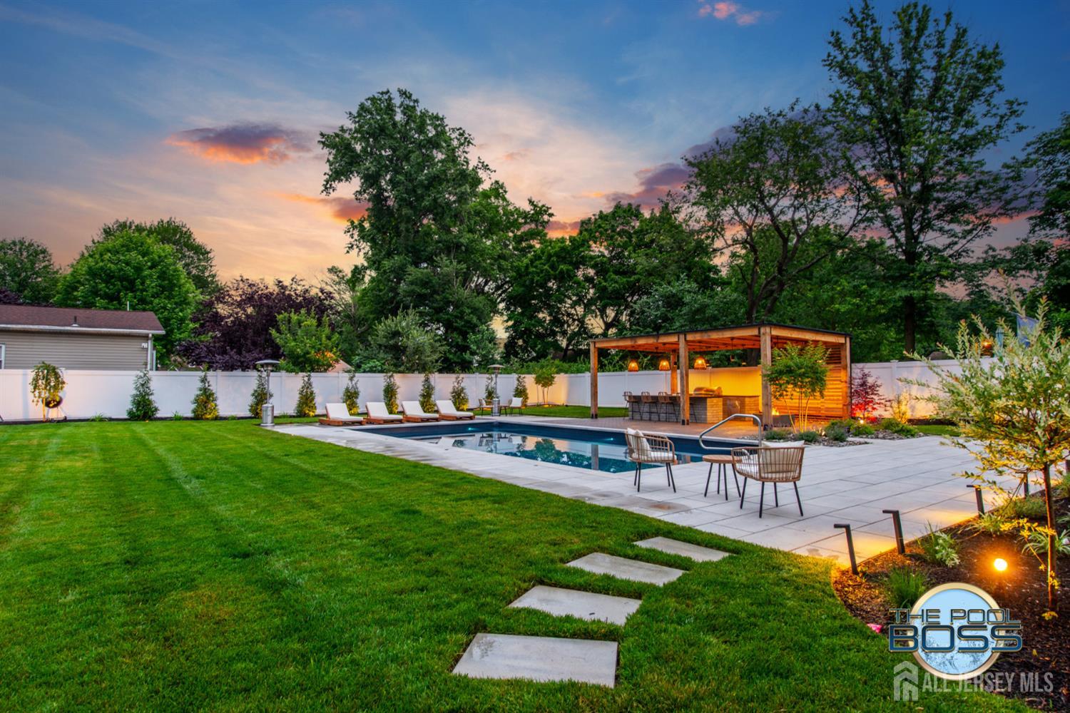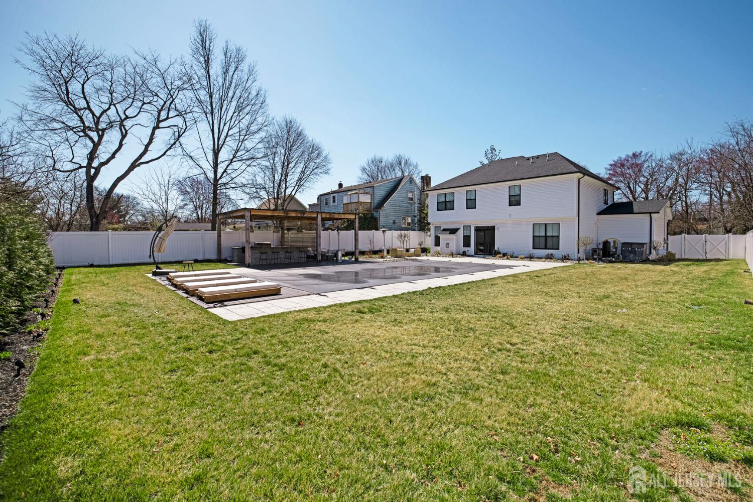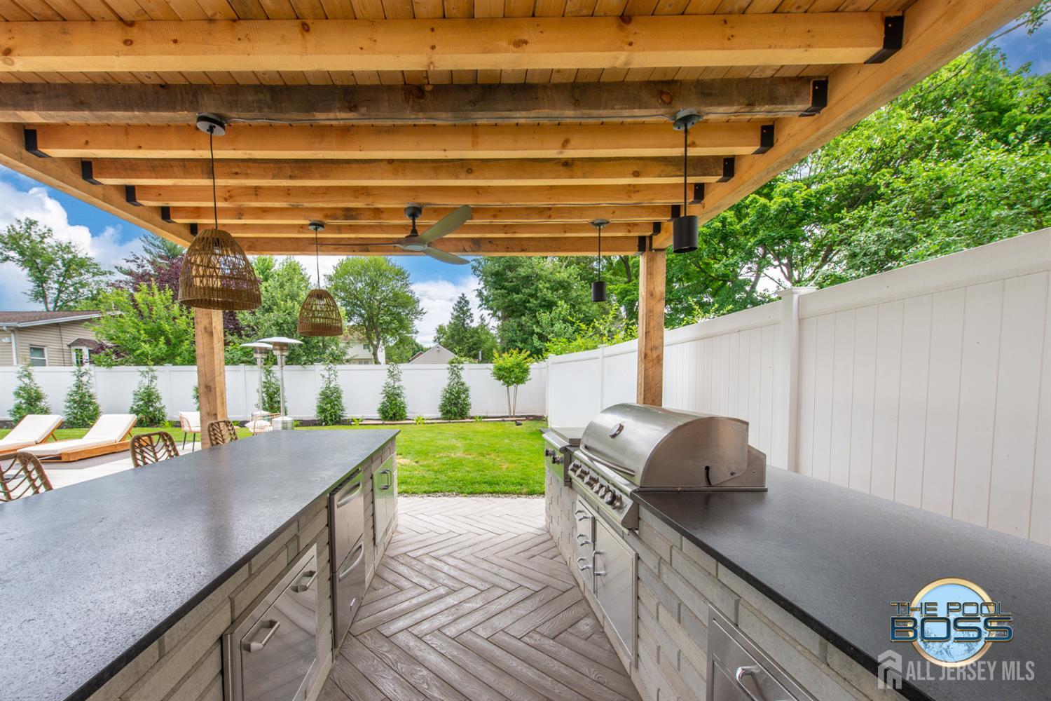 Welcome to 56 Philo Boulevard a stunning contemporary home where every detail has been curated for those who appreciate the finer things. Set on an exceptional lot in Edison, this 5-bedroom, 3-bathroom residence seamlessly blends refined interior living with one of the most extraordinary outdoor spaces you'll find in the area. The heart of this home extends well beyond its walls. Step outside to a true resort-caliber retreat: a custom inground pool framed by large-format bluestone coping, a designer timber-frame pavilion with exposed beam ceilings, ceiling fans, and ambient pendant lighting, and a fully equipped outdoor kitchen featuring stainless steel appliances, a built-in grill, premium dark countertops, and a generous island with bar seating. A concrete fire pit anchors the herringbone-patterned composite deck, creating an atmosphere that is equally suited for intimate evenings and effortless entertaining. Professionally landscaped grounds, mature trees, and strategic lighting complete the picture day or night, this backyard is simply unmatched. Inside the home reflects the same level of care and intentionality. This home boasts contemporary finishes, offering five generous bedrooms or use of an office/den and three full baths designed for comfortable, modern living. A first-floor room provides excellent flexibility, functioning beautifully as a private guest suite, home office, or den ideal for those seeking one-level convenience without sacrificing space. This home is completely move in ready, Schedule to see this home while you can! CJMLS 2613894R