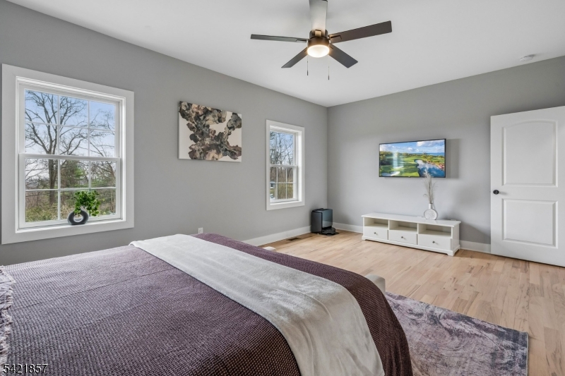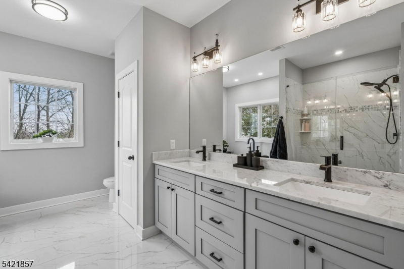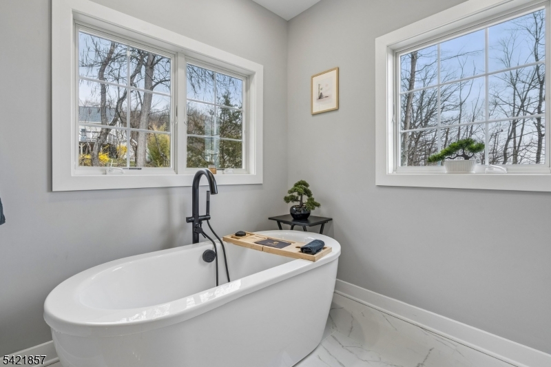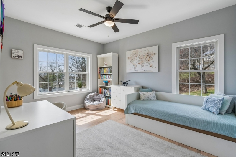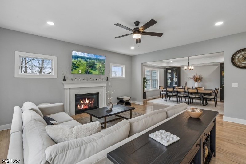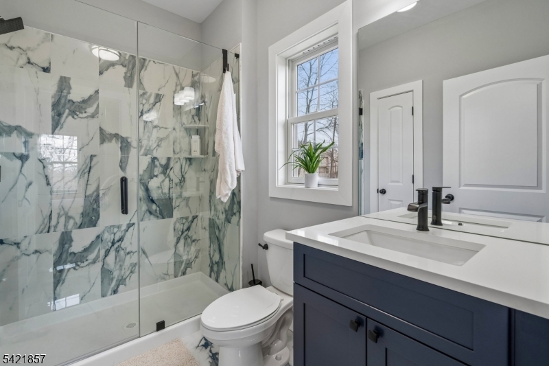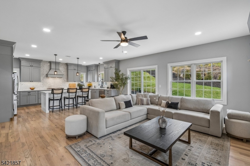 A 2025 build, taken beyond builder-grade by the current owners. Six bedrooms, four and a half baths, 4,800 finished square feet on a private double lot running up to Washington Rock State Park, with direct trail access. Perched on a quiet elevation with sweeping views, the home opens into a bright family room with white oak floors and nine-foot ceilings. A chef's kitchen with quartz-topped island and walk-in pantry flows off it, alongside a dining room with crown molding and a living room with gas fireplace. A first-floor bedroom with its own full bath, private enough for guests and quiet enough for a home office. Upstairs, the primary suite with soaking tub and walk-in shower is joined by three additional bedrooms, a full bath, and second-floor laundry. The finished lower level adds a sixth bedroom with its own full bath, plus open flex space. What sets this home apart: the post-build work. Stone veneer wraps the exterior. The back stairs were rebuilt in stone with new railing to match the front elevation. A paved patio with a French drain anchors the yard, and a paved path circles the house to a dedicated trampoline area. New sod and trees complete the landscaping. Hardwood floors sanded and refinished. Two walk-in closets added. Garage floor coated. New appliances throughout. EV-prewired two-car garage, 200-amp service, Watchung Hills Regional HS. Eight minutes to Dunellen station. Move-in ready, every major upgrade done, inside and out. GSMLS 4018498