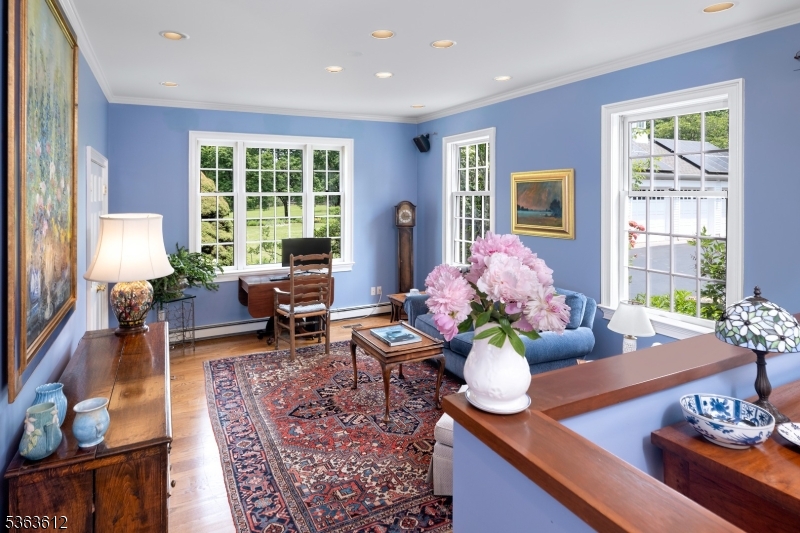 An elegant white 19th century Federal Style Home just 5 miles from Princeton stands on four acres with sweeping views of bountiful gardens, a picturesque pond and park-like lawns. Just passing by, it is clear that the current owners have been excellent stewards of this historic property. Even though the house was built with large rooms and high ceilings across all three floors, carefully considered expansions by acclaimed local architect Max Hayden have added still more space for entertaining, as well as the possibility of single-level living. French doors flanking the living room fireplace open to a glorious sunroom with a stone floor and a commanding stone fireplace. Off the celebration-sized dining room, the second addition serves as an office or a stunning guest suite. The eat-in kitchen has modern functionality with pro-level appliances and an open sightline into the family room, yet custom cherry cabinetry feels period-appropriate and a walk-in fireplace stands as a reminder of meals simmering all day over a constant flame. All have great closet space, especially the primary suite with a walk-in outside the cheerfully tiled bath. With a full kitchen and a clean white bathroom, the multi-room third floor serves equally well as a guest suite or a spot for all-day play and all-night sleepovers. Even the cupola capped garage beautifully supports the needs of a modern lifestyle with three bays, a workshop and solar panels. GSMLS 4016472